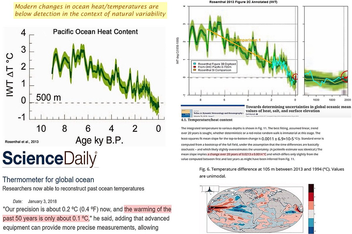 During the Holocene, the 0-1000 m fluctuated by 2°C/200 years. In contrast, the last 200 years of 0-1000 m changes are “below detection limits”. The former occurred without any change in CO2 concentration. The tiny latter change occurred with +50 ppm CO2.